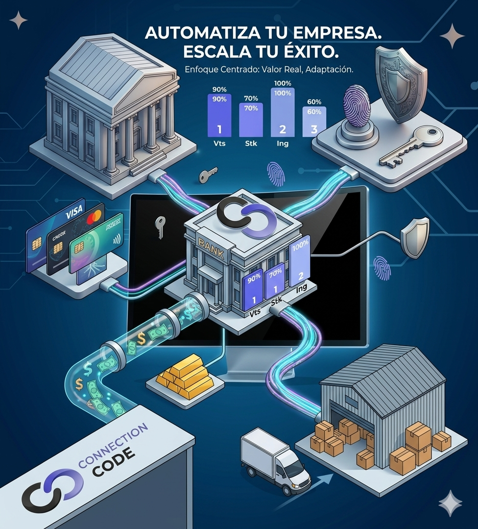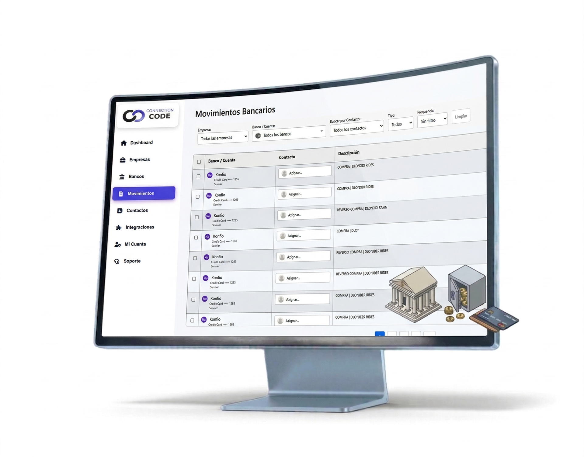 Olvídate de descargar archivos, importar datos o revisar múltiples portales bancarios. Connectioncode se encarga de mantener tus movimientos sincronizados en tiempo real, permitiéndote trabajar con información precisa en todo momento.